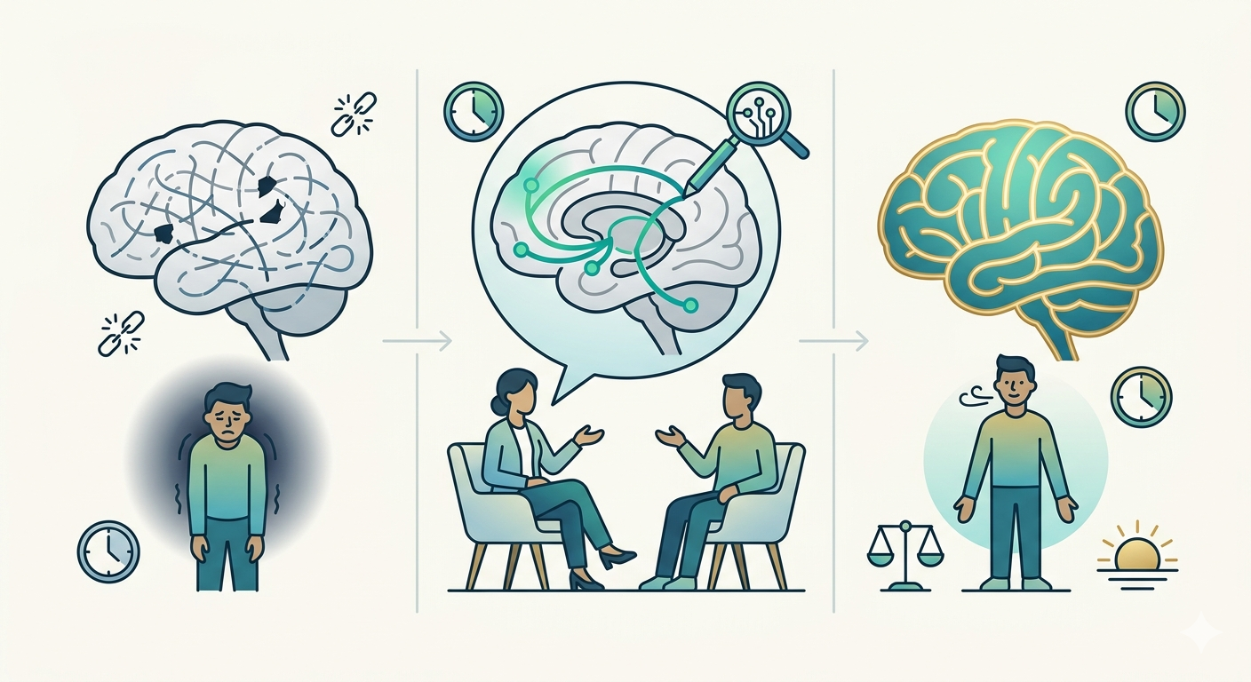 Conceptually, this fits with the idea that early in treatment patients may shift their appraisal, attention, and emotional responding before those shifts stabilise into durable habits. Later, as new strategies are repeated, they may become more automatized and accompanied by more substantial network reorganisation (Kühn & Gallinat, 2013; Miskovic et al., 2022). In the social anxiety literature, changes in connectivity during treatment have been shown to predict symptom trajectories from 6 to 12 months post‑treatment, indicating that the clinically meaningful consequences of therapy‑related neuroplasticity may continue to unfold after formal sessions have ended (Heinrichs et al., 2022). In borderline personality disorder, some of the structural changes appear to emerge after the treatment period, suggesting that the brain may continue to remodel in the weeks following active intervention (Krause‑Utz et al., 2020). This pattern implies a multi‑phase course of change: an early phase involving shifts in appraisal, attention, and distress tolerance; a mid‑phase characterised by altered connectivity in regulatory networks and reduced symptom expression; and a later phase in which new behavioural patterns are consolidated and may be supported by structural consolidation (Straube et al., 2022; Miskovic et al., 2022).